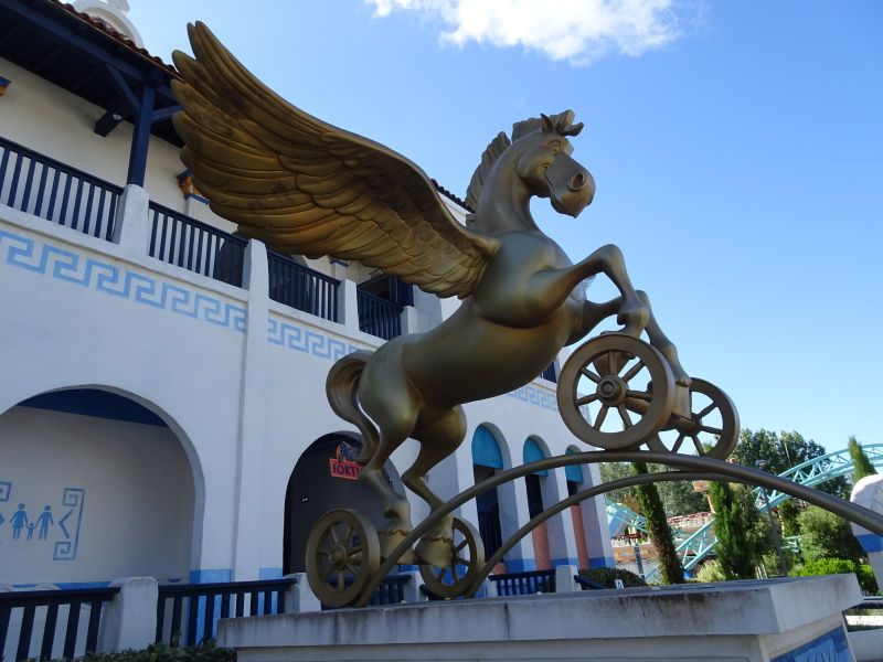 Avec l'ouverture plus tôt pour les résidents des hôtels, nous avons commencé notre journée avec Pégase Express. Il s'agit d'une montagne russe propulsée qui propose un début de parcours en marche avant puis une petite scène et une portion en marche arrière. La thématisation est vraiment bonne, on y a retrouve tout l'humour de la BD et de l'univers d'Astérix. L'attraction en elle même est vraiment sympa et procure quelques sensations. Elle est vraiment accessible même pour les plus jeunes dont ce serait la première montagne russe. La scène dans le bâtiment semble déjà avoir bien vécu avec des effets manquants et un panneau manquant pour provoquer l'obscurité mais la magie opère avec le jet d'eau et la propulsion en marché arrière. La partie en marche arrière est super amusante avec tous les petits virages.