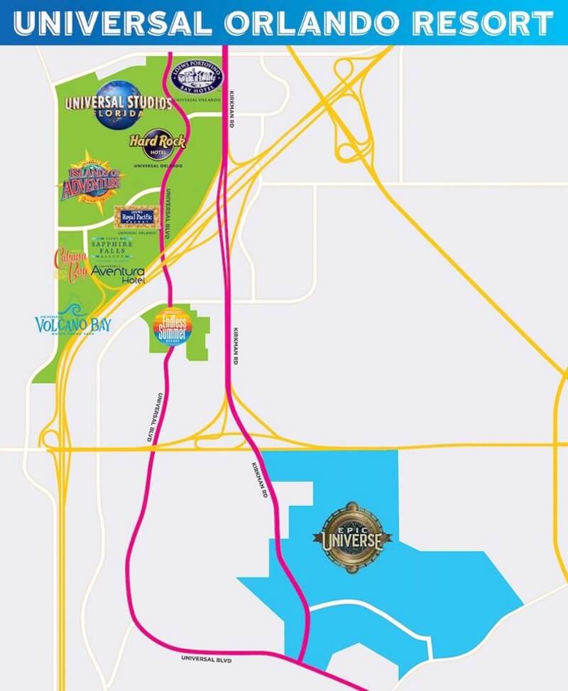 Sur ce schéma, nous pouvons voir que le parc sera à une certaine distance du Resort existant, il sera construit près de l'Universal Boulevard qui sera prolongé depuis le complexe hôtelier Endless Summer Resort. A ce stade nous ne connaissons pas le prochain système de transport qui fera les navettes entre les deux zones. Soit Universal crée la surprise et crée un moyen de transport qui établit un lien entre deux zones de deux parcs (comme le Hogwarts Express qui relie les deux parcs Universal entre les deux zones Harry Potter) soit il démarre un réseau de bus comme ce qu'il a fait avec Volcano Bay.
