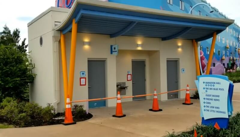 Au Disney's Pop Century, la station n'est plus entourée de murs de construction. Les couleurs définitives sont en place et tout semble prêt pour pouvoir accueillir les premiers guests dans ce système de télécabines.