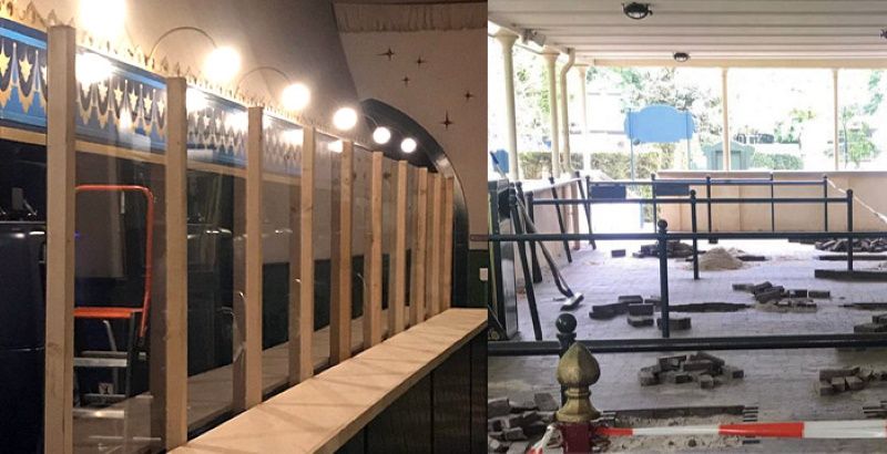 A gauche, panneau de plexiglas à Droomvlucht et à droite, aménagement de la file d'attente de la Villa Volta à Efteling, crédit Looopings