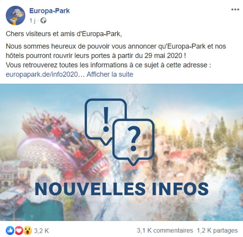Annonce d'Europa-Park sur sa page Facebook