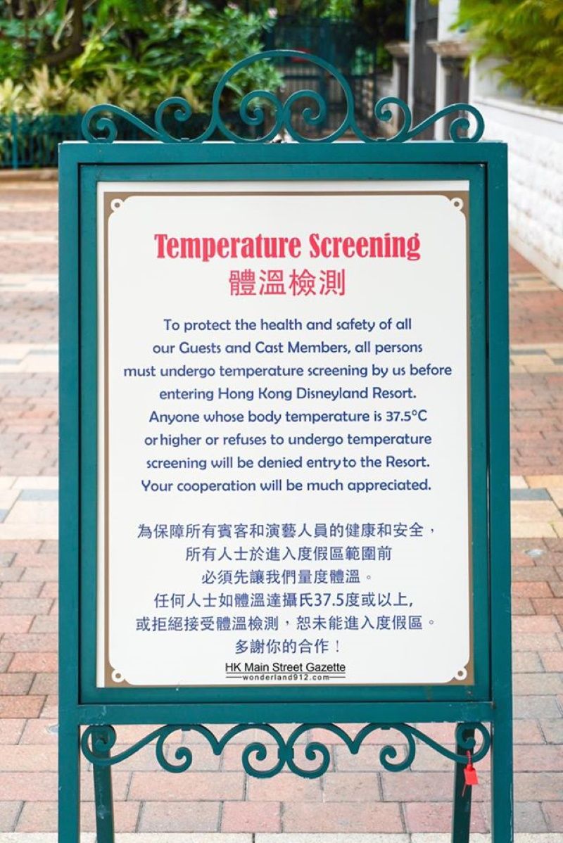 Panneau à l'entrée d'Hong-Kong Disneyland pour la prise de température, crédit HK Main Street Gazette
