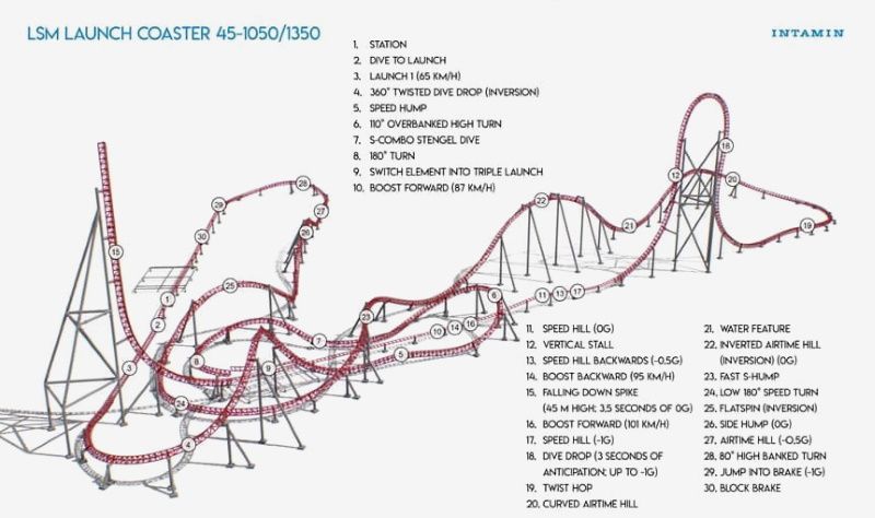 Le parc Astérix situé à Plailly dans l'Oise, se développe à vitesse grand V depuis quelques années. En 2022, La compagnie des Alpes y ouvrira l'une des futures montagnes russes les plus impressionnantes d'Europe. Le constructeur Suisse Intamin a dévoilé les plans lors de l'exposition IAAPA en Floride qui a eu lieu il y a quelques mois. Vous pourrez en découvrir un modèle de même style à Busch Gardens Williamsburg en 2020. La montagne russe qui n'a pas encore de nom sera construire derrière la trace du Hourra. Vu sa hauteur maximale de 45 mètres, nous pourrons l’apercevoir depuis l'autoroute A1 comme le petit Oziris. Le circuit possédera deux systèmes de propulsions magnétiques avec une particularité. Le premier lancera le train sur une première partie du circuit classique et, surprise, le train sera propulsé une première fois sur un Top Hat, il partira en marche arrière tout en haut d'une rampe verticale et sera propulsé une dernière fois de nouveau sur le Top Hat pour terminer le circuit. Ce sera une montagne russe très intense avec 23 moments d'airtimes, une vitesse maximale de 107 km/h, un circuit de 1075 mètres de long et trois inversions. Le plan ci dessus n'est pas définitif, il vous montre ce que pourrait être le parcours. Merci à Etienne pour ces précisions. Nous avons vraiment hâte de tester la bête, plus que 2 ans à patienter !