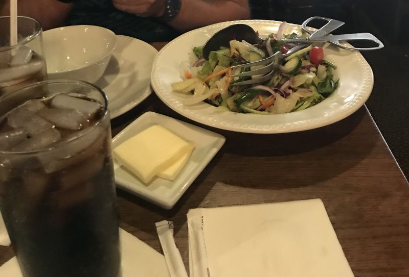 Un serveur vient prendre notre commande des boissons et quelques instants plus tard, on nous amène la Declaration Salad ainsi que du pain brioché tiède et du beurre doux.
