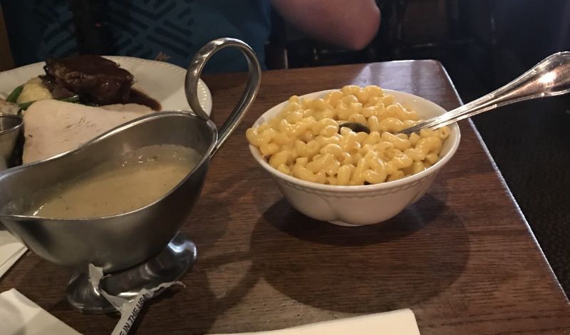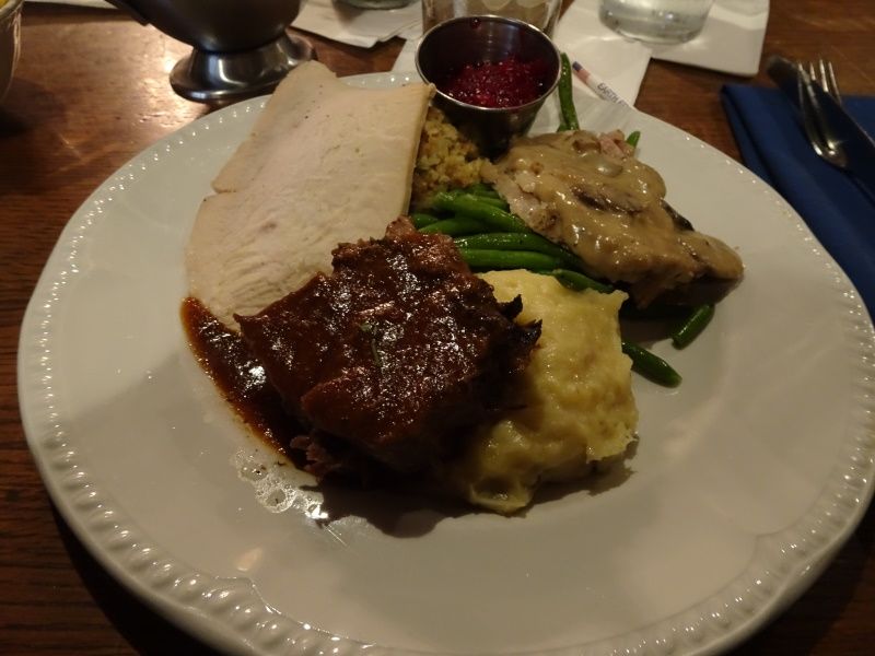 Il y avait 3 sortes de viandes, une belle tranche de poitrine de dinde, une épaisse tranche de porc rôti avec une délicieuse sauce aux champignons, des morceaux de bœufs mijotés. En accompagnement, une bonne purée maison bien assaisonnée, des haricots verts encore croquants, une farce succulente, de la confiture d'airelles légèrement sucrée et des Mac&Cheese, des macaronis au fromage fondants.