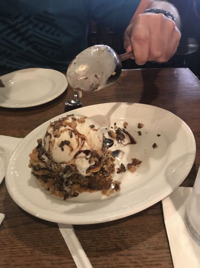 Tout ceci à volonté, vous pouvez redemander ce que vous voulez, même les boissons. Après une petite pause, vient l'heure du dessert, un Ooey Gooey Toffee Cake, c'est un genre de brownie à la vanille, avec une crème glacée vanille et de la sauce au chocolat.