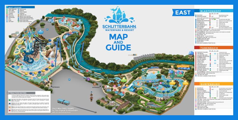 Ce parc est situé à New Braunfels, au nord-est de San Antonio. Depuis le 13 juin 2019, il est la propriété du groupe Cedar Fair (Cedar Point, Carowinds). Schlitterbahn a "grandi" sur les rives de la rivière Comal il y a 40 ans. Les toboggans et les piscines utilisent de l'eau de rivière alimentée par une source qui reste toujours fraîche à 22 degrés et retourne directement dans la rivière. Montez les célèbres tubes noirs pendant des heures dans la section originale mettant en vedette le château emblématique. Trouvez facilement de l'ombre sous les arbres et passez la journée en famille avec votre propre pique-nique. Bien sûr, les rivières ne sont qu'un début. À seulement un court trajet en tramway dans les sections Blastenhoff et Surfenburg, les visiteurs de New Braunfels peuvent monter une vague continue sur la Boogie Bahn, voler haut sur le Sky Coaster, flotter sur la rivière à vagues Torrent et monter en flèche sur le Master Blaster Water Coaster. Ce parc fait partie d'un Resort et d'une destination de vacances d'été pour de nombreuses familles. Celles ci peuvent louer une simple chambre d’hôtel ou un cottage de 7 chambres maximum.