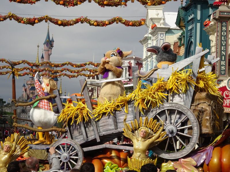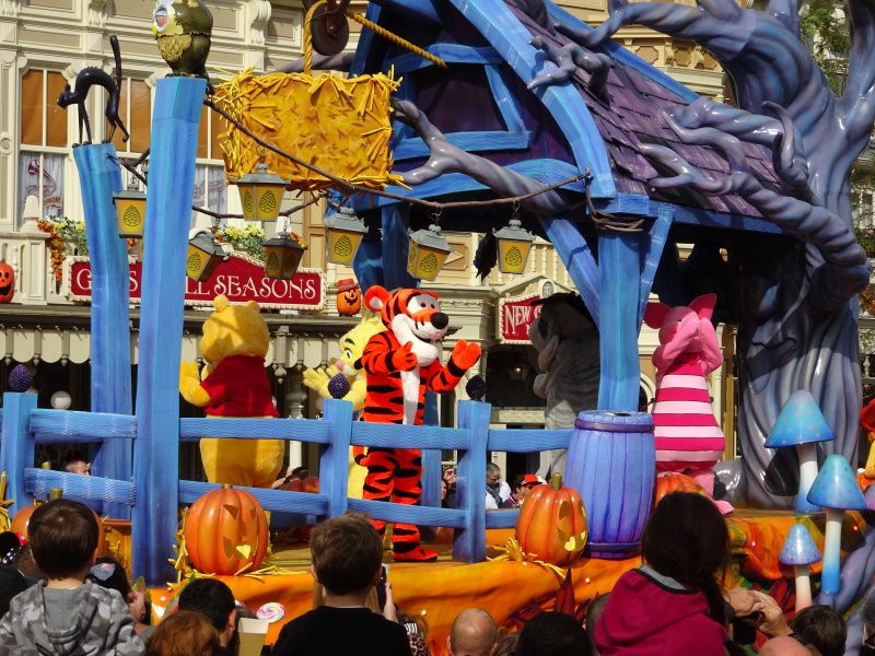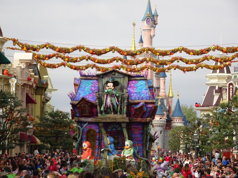 La parade s’élance avec plusieurs chariots et pleins de personnages pour notre plus grand plaisir ! Les chars sont bien décorés et ont tous une ambiance particulière. Notre préféré est sans aucun doute le dernier, celui de la grande star du parc, notre Mickey déguisé en hôte de la maison hantée avec son chapeau couleur citrouille.