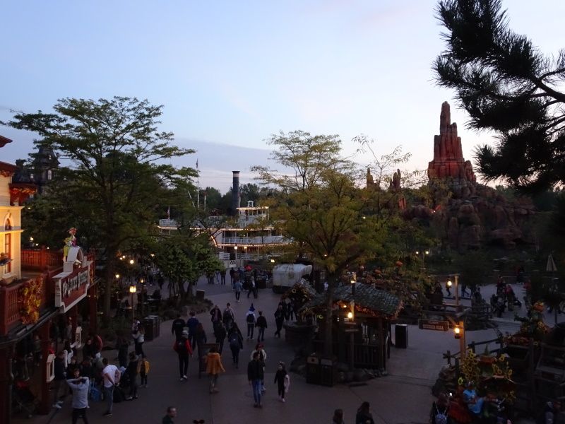Nous nous rendons pour la dernière fois de la journée à l'entrée de Frontierland pour explorer le Fort Comstock et avoir une vue panoramique sur le Land. La vue y est sublime avec au premier plan les figurines avec des têtes de citrouilles, les guirlandes d'Halloween et au loin, le Molly Brown, Phantom Manor et surtout Thunder Mesa, la montagne abritant le train de la mine.