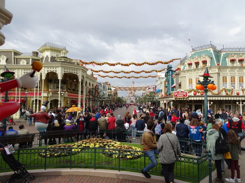 Nous passons par Fantasyland pour prendre en photo les ronces installées derrière le château. Apres s’être régalés au Captain Jack's, nous allons faire notre Fast-Pass Star Tour avec exactement la même expérience que dans les Disney's Hollywood Studios en Floride avec l'impression d'une image un peu plus floue. Nous décidons d'aller découvrir plus en détail les décorations sur Main Street et d'un coup une annonce retenti, la parade d'Halloween va bientôt démarrer. Nous nous installons sur le kiosque central un peu surélevé pour ne rien manquer du spectacle.