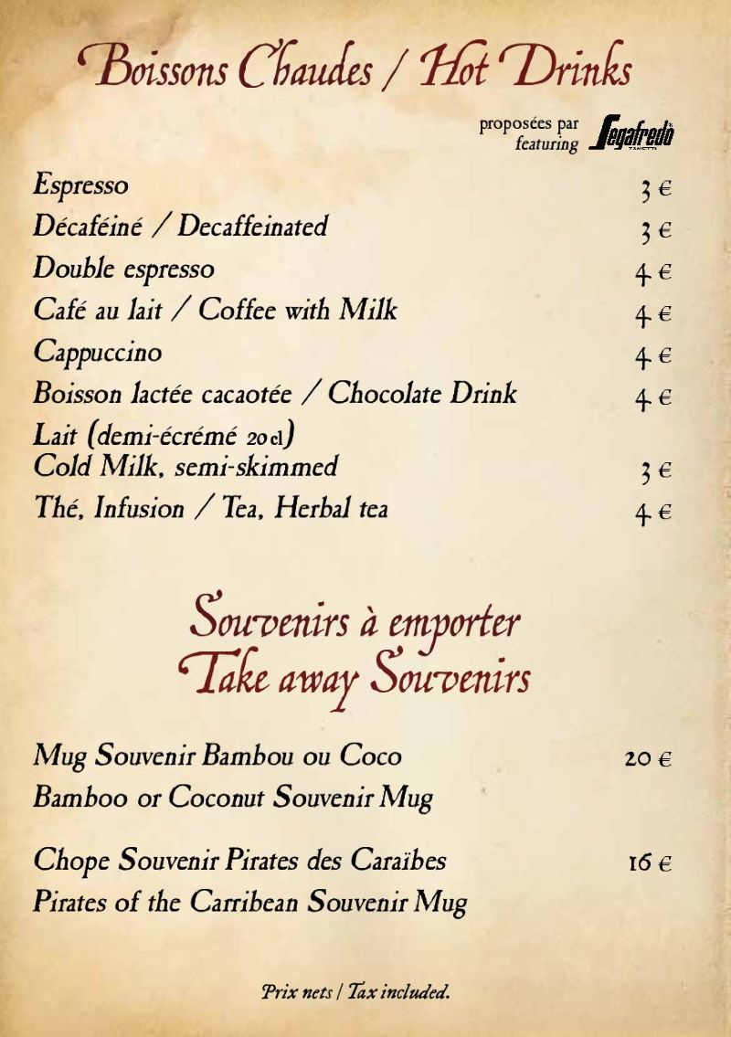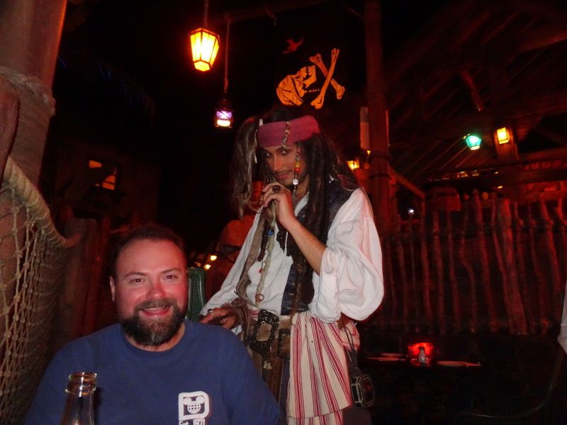 Bien sur, la star du lieu, le pirate Jack Sparrow fera le tour de votre table lorsque votre plat sera terminé, il prendra la pose avec vous et vous racontera quelques pirateries.