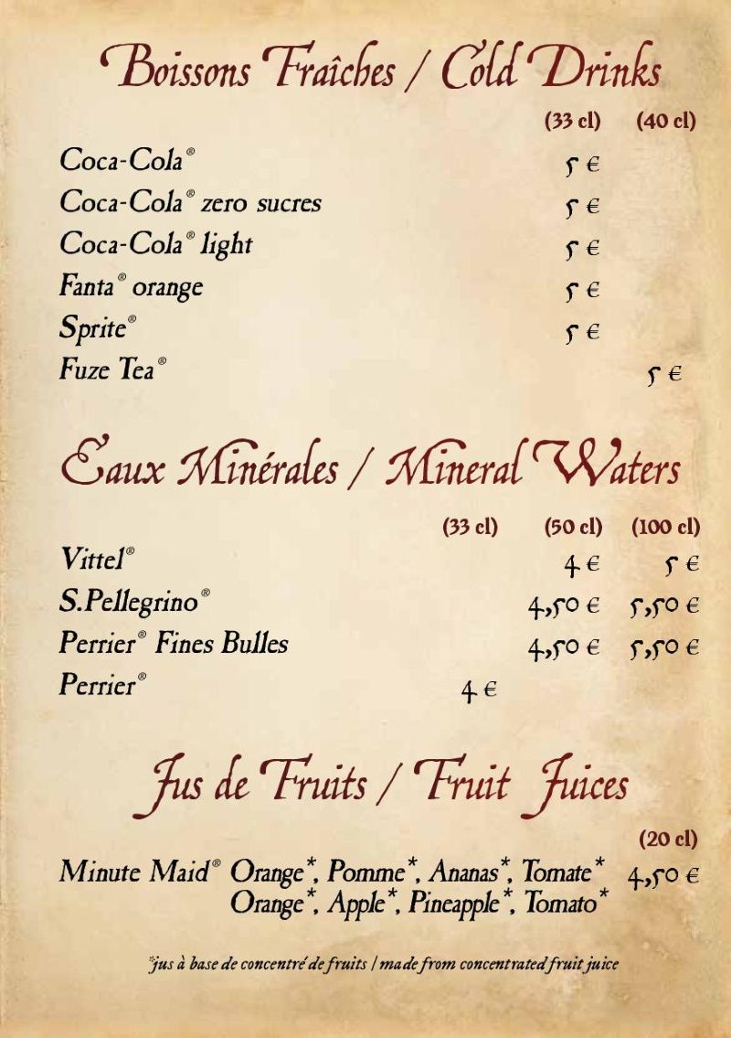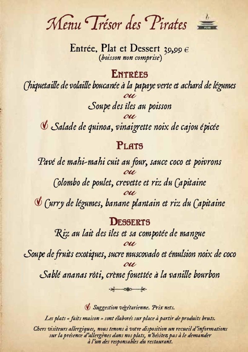 Julien a choisi le menu trésor des pirates avec en entrée, la salade de quinoa, en plat, colombo de poulet et crevettes et en dessert, sablé ananas rôti. De mon coté j'ai choisi le menu la perle des 7 mers avec en entrée, boudin épicé et bananes plantain rôties, en plat, fondant de bœuf au tamarin et en dessert, bananes cuites au rhum et noix de pécan caramélisées. Pour les boissons nous sommes restés sur du soft, on ne va pas passer pour des alcooliques notoires :-) notre addition s'est élevée à un peu moins de 100 euros, des prix conformes pour un restaurant service à table dans un parc d'attraction et en adéquation avec la qualité des produits.