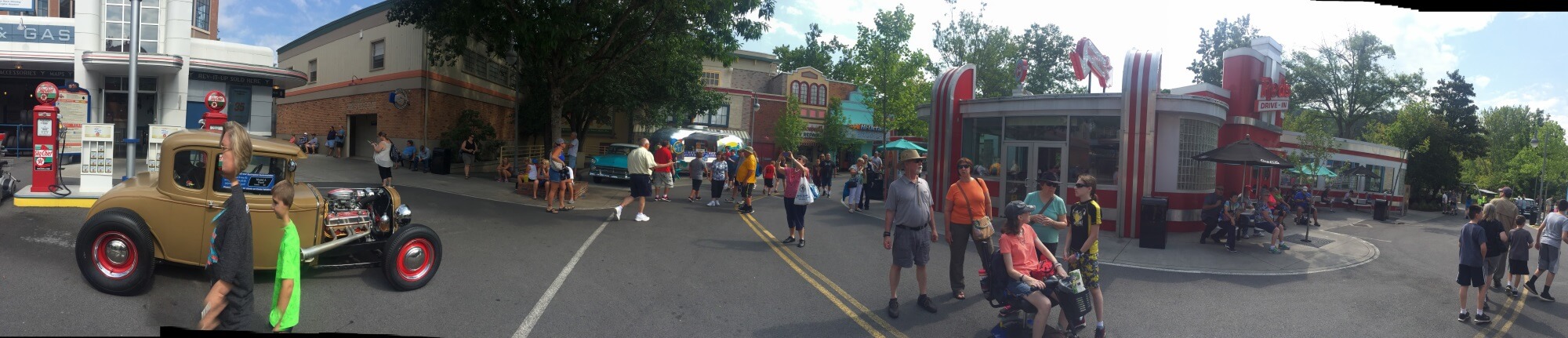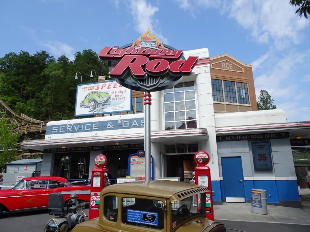 Situé dans la zone Jukebox Junction, thématisé sur les courses de Hot Rod dans les années 1920 à 1950, il est accompagné d'un petit circuit automobile où les enfants peuvent conduire en toute sécurité des modèles réduits guidés par un rail, un diner typique, un magasin (où j'ai acheté deux t-shirts sur mon coaster préféré et un décapsuleur, kit indispensable :-p) et un snack vendant du poulet fri.