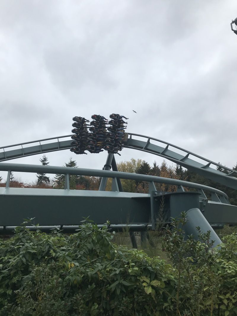 Nous faisons le parcours water de la double montagne russe de Joris en de Draak qui avec la pluie est super intense et rapide, nous avons bien décollé de notre siége.