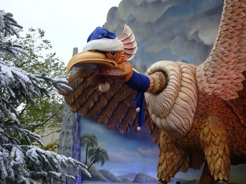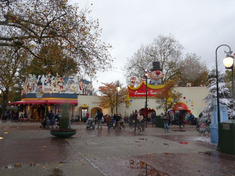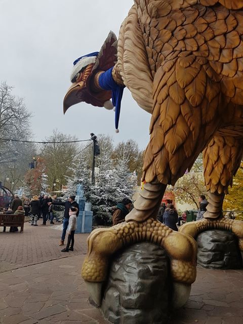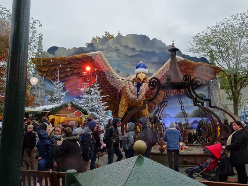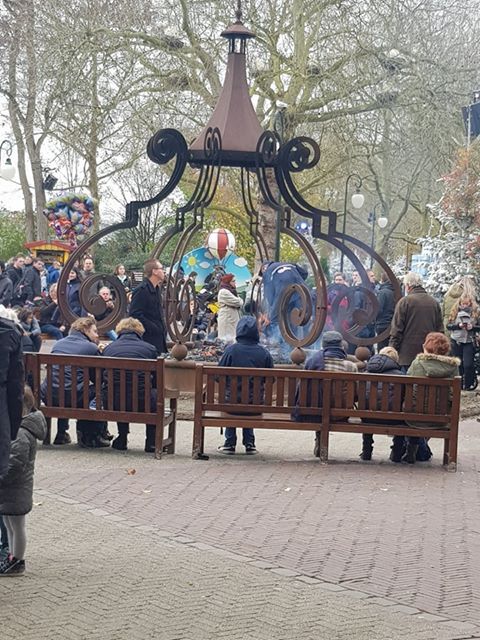 Arrivé au parc vers 10h15, les horaires en semaine sont assez court, de 11 h à 18 h, nous pouvons quand même rentrer et prendre une petite collation dans le restaurant La Place situé juste à gauche après l'entrée dans le parc. Nous allons prendre quelques photos de Symbolica, Pardoes est installé devant son point photo.De nombreuses décorations sont présentent le long de l'avenue principale avec des sapins poudrés de fausse neige, des guirlandes enroulées autour des rambardes avec des petites ampoules allumées le soir, un gros podium avec un trône fait de paquets cadeaux devant plusieurs sapins.