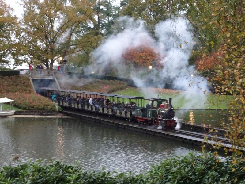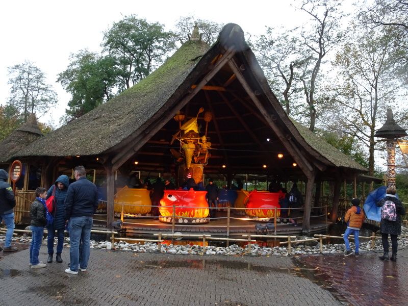 Le train à vapeur est situé juste derrière, et comme il pleut, on se décide à faire le tour du parc avec lui. Nous descendons à la gare située près du bois des contes, juste à coté de droomvlucht et de Villa Volta que l'on fait tout de suite. C'est une Madhouse classique avec deux pré-shows malheureusement uniquement en néerlandais. Après c'est direction le vol au pays des songes avec son système unique de gondoles suspendues. Les décors avec les fées et les fausses fleurs sont très kitsch mais la scène de nuit avec la ville suspendue et la descente en spirale dans la forêt des gnomes sont top ! C'est un immanquable du parc au même titre que Symbolica.