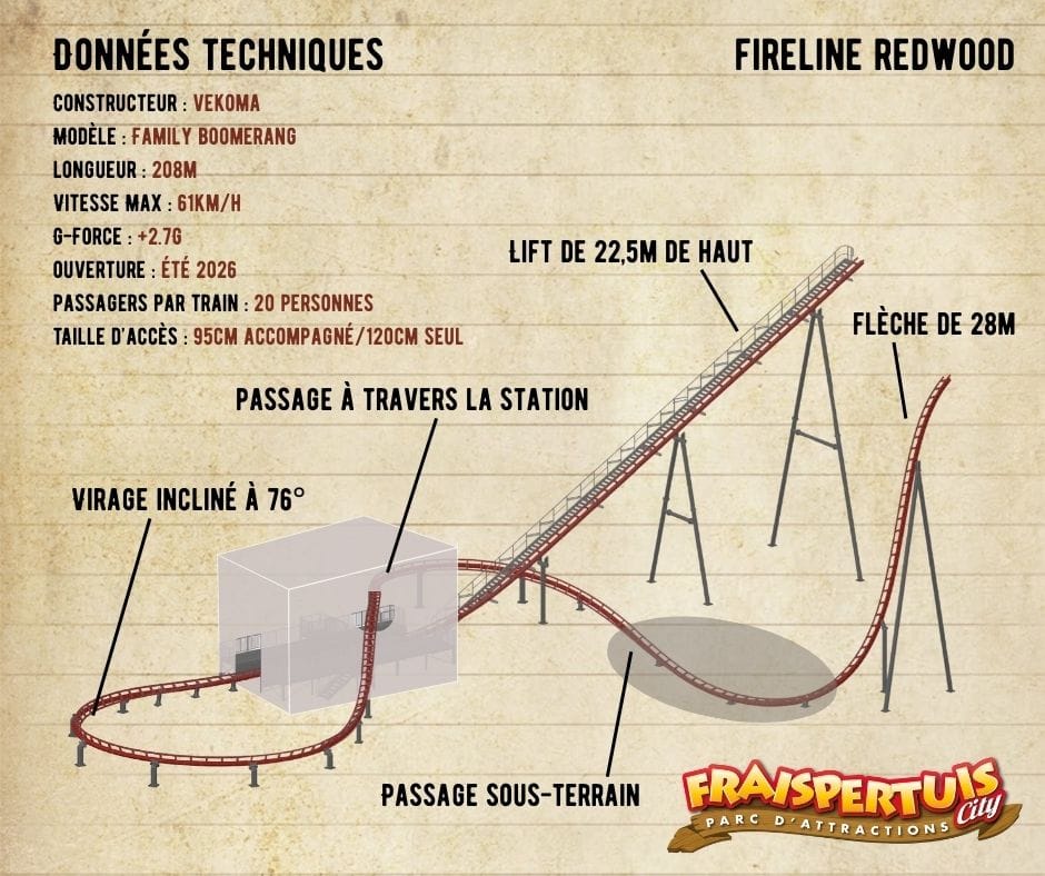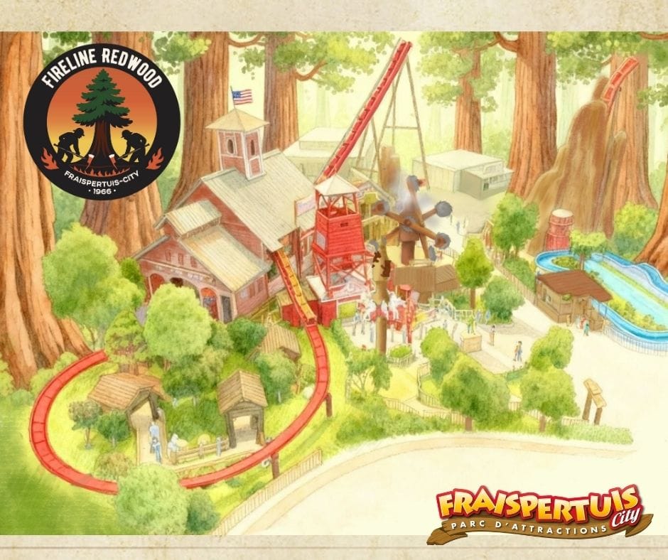 La star de cette saison anniversaire sera sans conteste Fireline Redwood, une montagne russe signée par le célèbre constructeur néerlandais Vekoma. Mais attention, il ne s'agit pas d'un modèle sur catalogue, mais bien d'un Family Boomerang entièrement développé sur mesure pour s'intégrer parfaitement à l'environnement du parc.