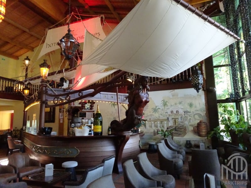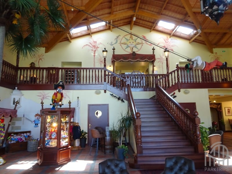 Le lobby de l'hôtel est assez grand avec une grande baie vitrée donnant sur le parc. Vous pourrez profiter du bar avec cette vue et un ameublement totalement revu qui invite à se poser. Sur votre gauche se trouve le réception avec une petite boutique dans laquelle un animatronique de perroquet vous parle. La décoration du lobby est soignée sans être trop chargée. Le mobilier de la réception de l'hôtel a été changé en début de saison 2020 et apporte une touche de modernisme à l'ensemble.