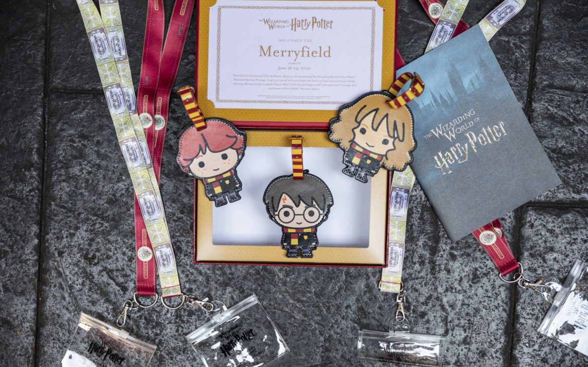 Lorsque vous réservez ce package, un paquet vous attendra dans votre chambre. Il s'agit d'une superbe boîte (voir photo de couverture) qui contient quelques cadeaux qui feront basculer votre voyage en vacances magiques. Vous pourrez dans un premier temps conserver cette jolie boîte rouge assez intrigante. En l'ouvrant, vous pourrez y trouver une lettre personnalisée de bienvenue, des étiquettes pour vos bagages avec Harry Potter, Ron Weasley et Hermione Granger, un tour de cou pour chacun des membres de votre famille afin d'y ranger soigneusement vos billets d'entrée et un petit guide sur les 2 zones Harry Potter se trouvant dans Universal Studios Florida et Islands Of Adventure avec les attractions, les magasins et les lieux où prendre un repas à l'anglaise.