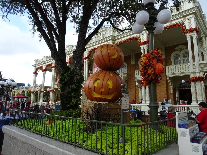 Quelques guirlandes sur les façades, des épouvantails et quelques citrouilles dans les parterres de fleurs, alors qu'à Paris, il y a énormément de décorations sur les bâtiments, pleins de citrouilles sont disséminées partout, même Frontierland est superbement décoré chez nous. Si vous voulez comparer les décorations, visionnez notre séjour Halloween à Disneyland Paris :
