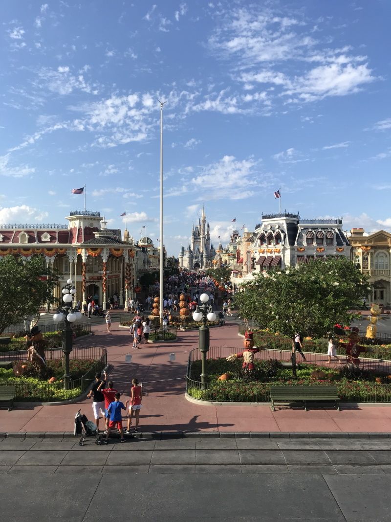 Avec la vue sur le château, totalement différent de celui de Paris, avec des couleurs plus terne mais tout autant élancé. Les coursives derrières les boutiques ne sont pas présentes là bas, ce qui entraîne une plus grosse congestion de la rue principale lors de la fermeture du parc ou lors de la parade. Bon point pour Paris. La Main Street est aussi longue mais avec des façades et des magasins placés différemment. La décoration spéciale d'Halloween m'a paru légèrement moins présente en Floride qu'à Paris mais c'est mon avis.